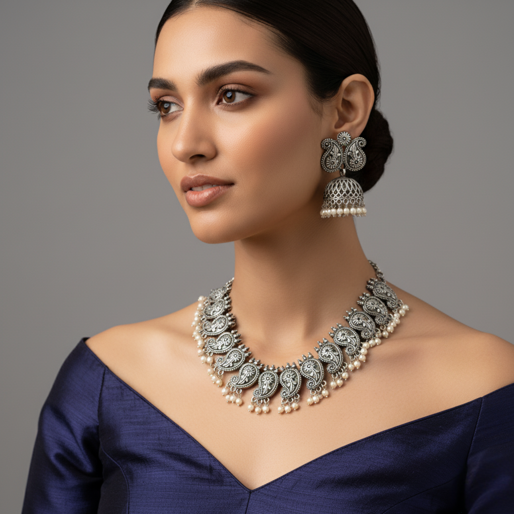 Absolutely stunning! The antique black oxidized finish is rich and the floral petal motifs are beautifully detailed. The white pearl danglers add such elegance. I wore this to a wedding and felt like royalty. Surprisingly lightweight despite the heavy look. Perfect craftsmanship from ElegantLike!