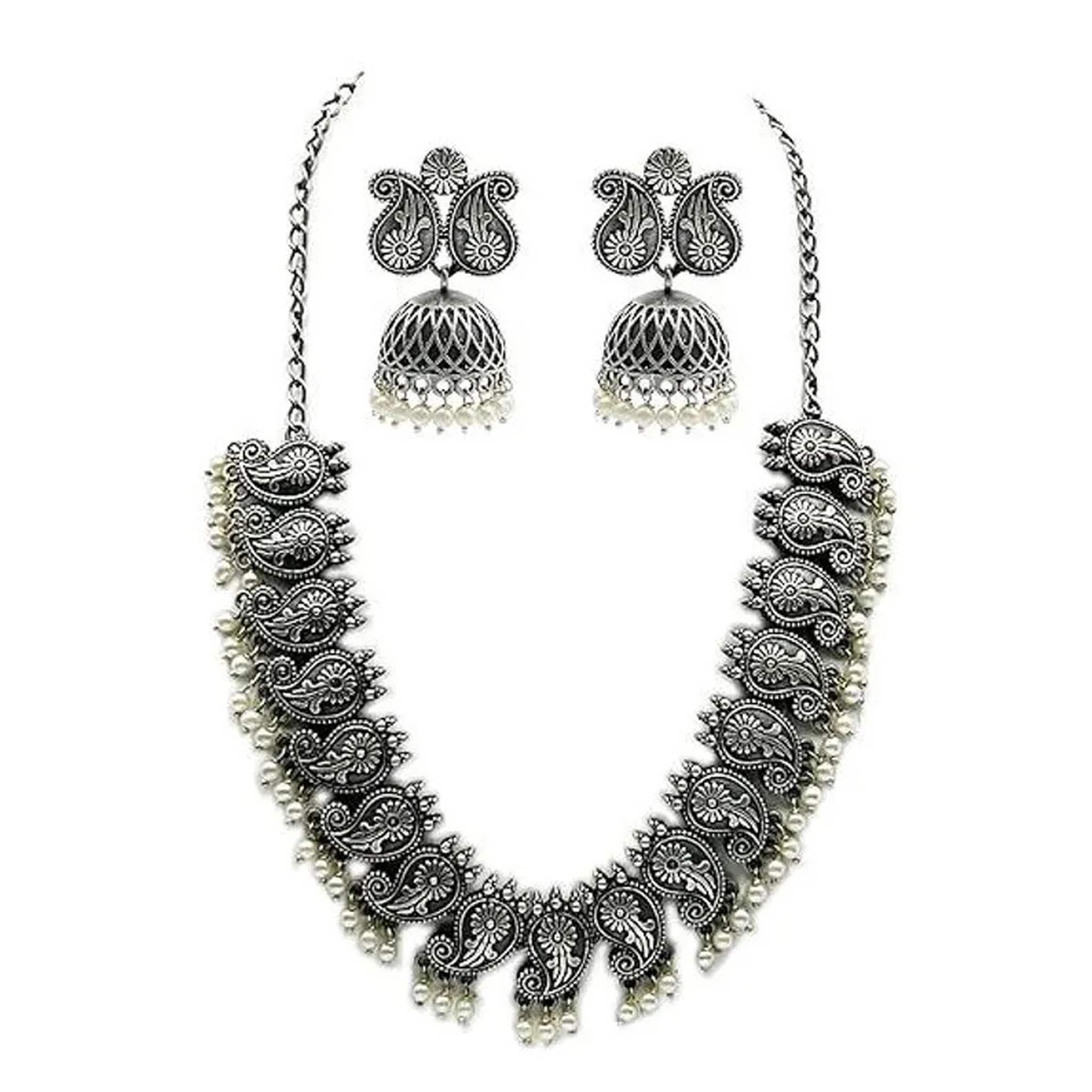 The set comes with matching oxidised jhumka-style earrings adorned with floral detailing and pearl drops, completing the regal look. Despite its heavy antique design, the jewellery remains lightweight and comfortable, perfect for long festive wear.