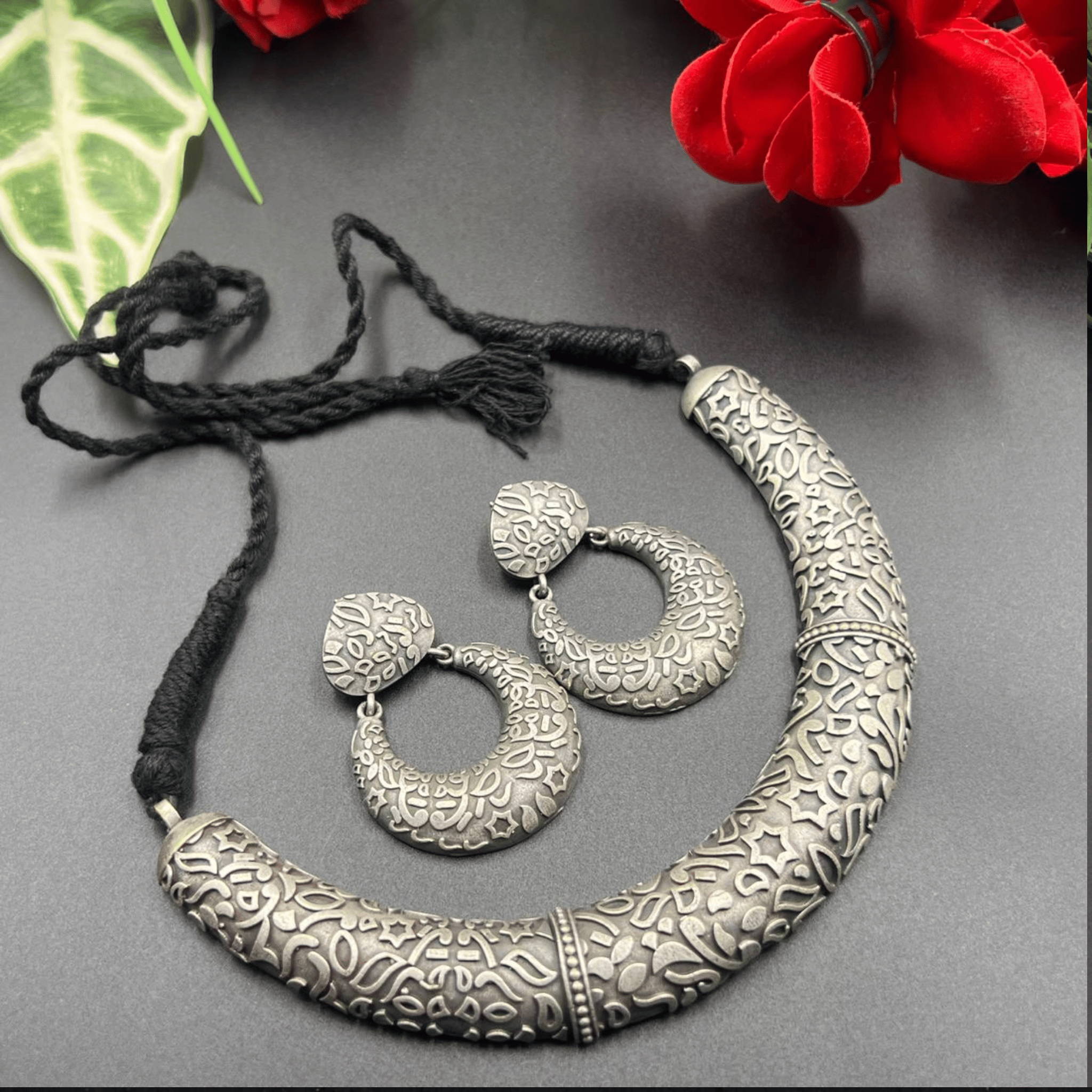 Crafted for lovers of timeless heritage jewelry, this Antique Choker Set features a bold, crescent-shaped choker paired with matching, engraved earrings. The surface is adorned with intricate floral and geometric carvings inspired by ancient Indian metal artistry. Finished in a deep oxidised silver tone, this set delivers a powerful statement while maintaining refined elegance, making it ideal for festive, wedding, and traditional styling.
