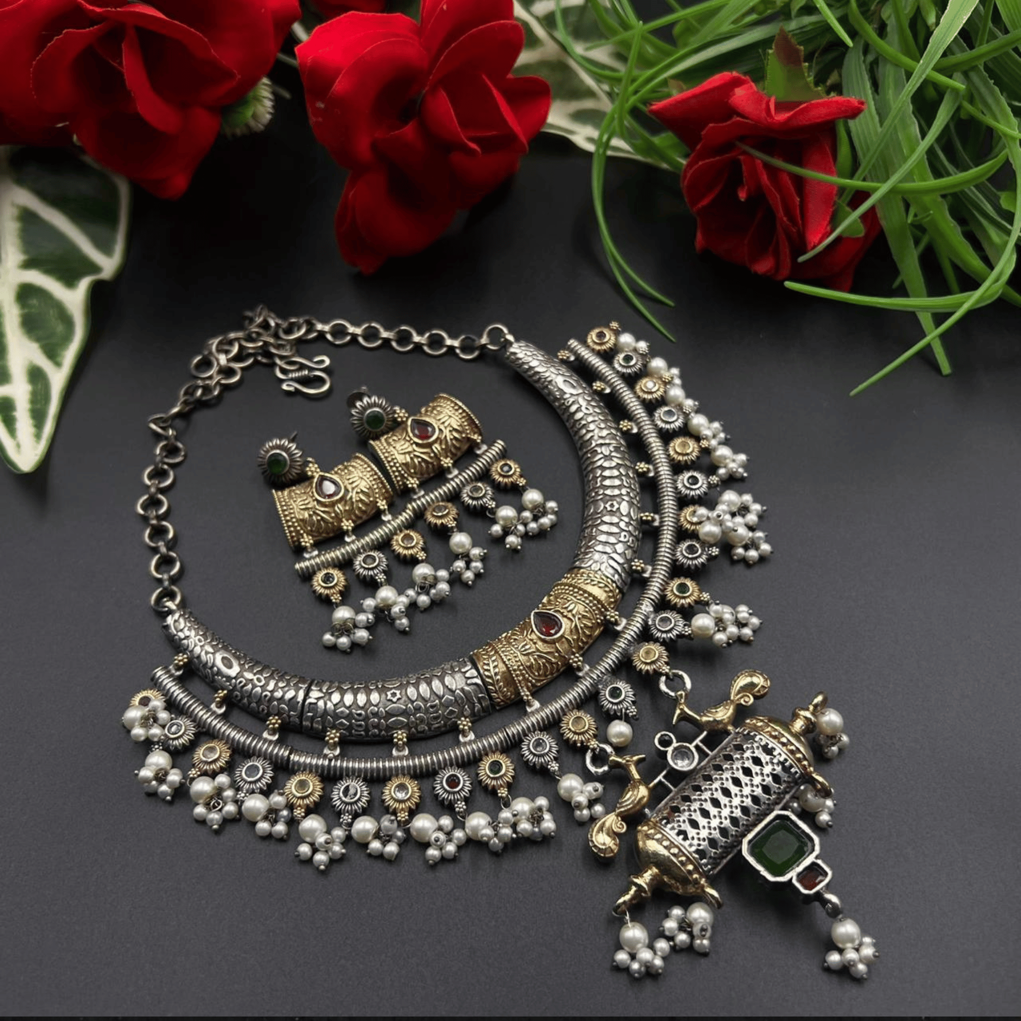 This jewelry set is absolutely breathtaking! The mix of oxidized silver, gold tones, and pearl drops looks so rich and elegant. It feels premium and sits beautifully on the neck. I wore it to a wedding and received endless compliments.