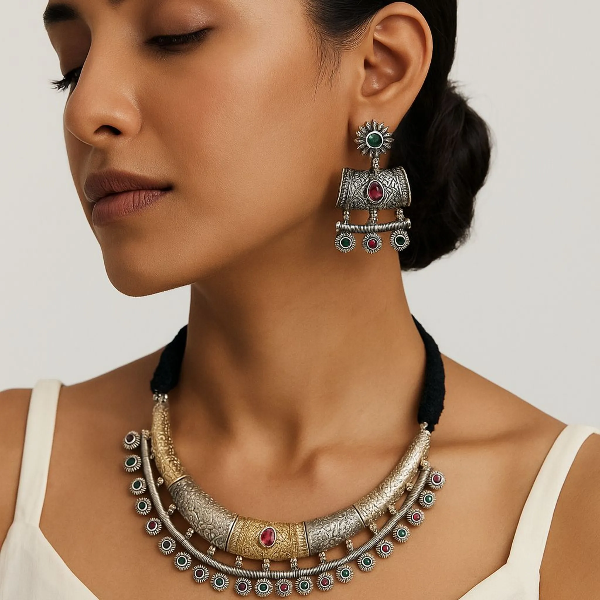 Make a regal statement with this dual-tone oxidised silver hasli necklace set, crafted with antique artistry and adorned with coloured stone accents. The necklace features a bold crescent-shaped design in oxidised silver, highlighted with antique gold detailing and embellished with green and ruby red stonework that adds a rich festive charm. The matching earrings mirror the design with layered elements, creating a complete look that is both bold and elegant.