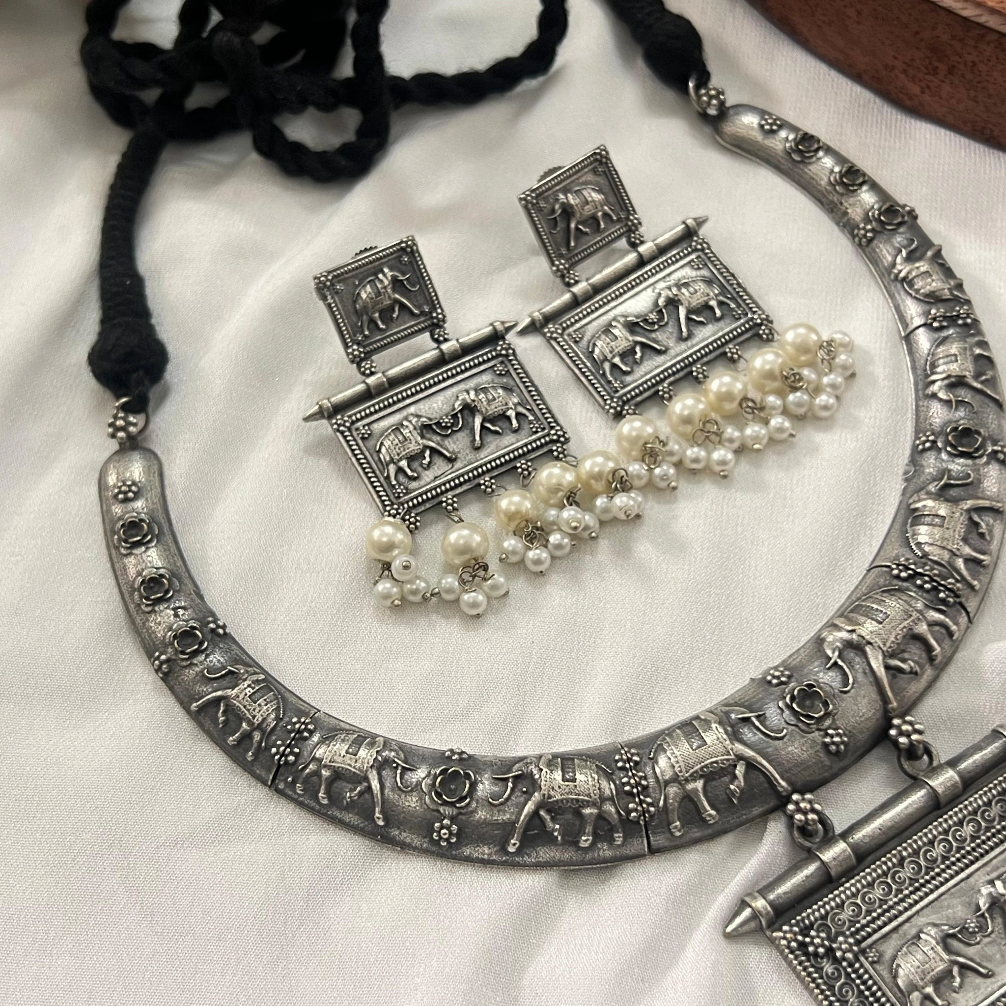 This handcrafted Oxidized German Silver Hasli Necklace Set with Pearls & Earrings is a unique blend of cultural heritage and elegance. The necklace features a bold Hasli design adorned with intricate elephant engravings and finished with dangling pearl beads that add a touch of sophistication.