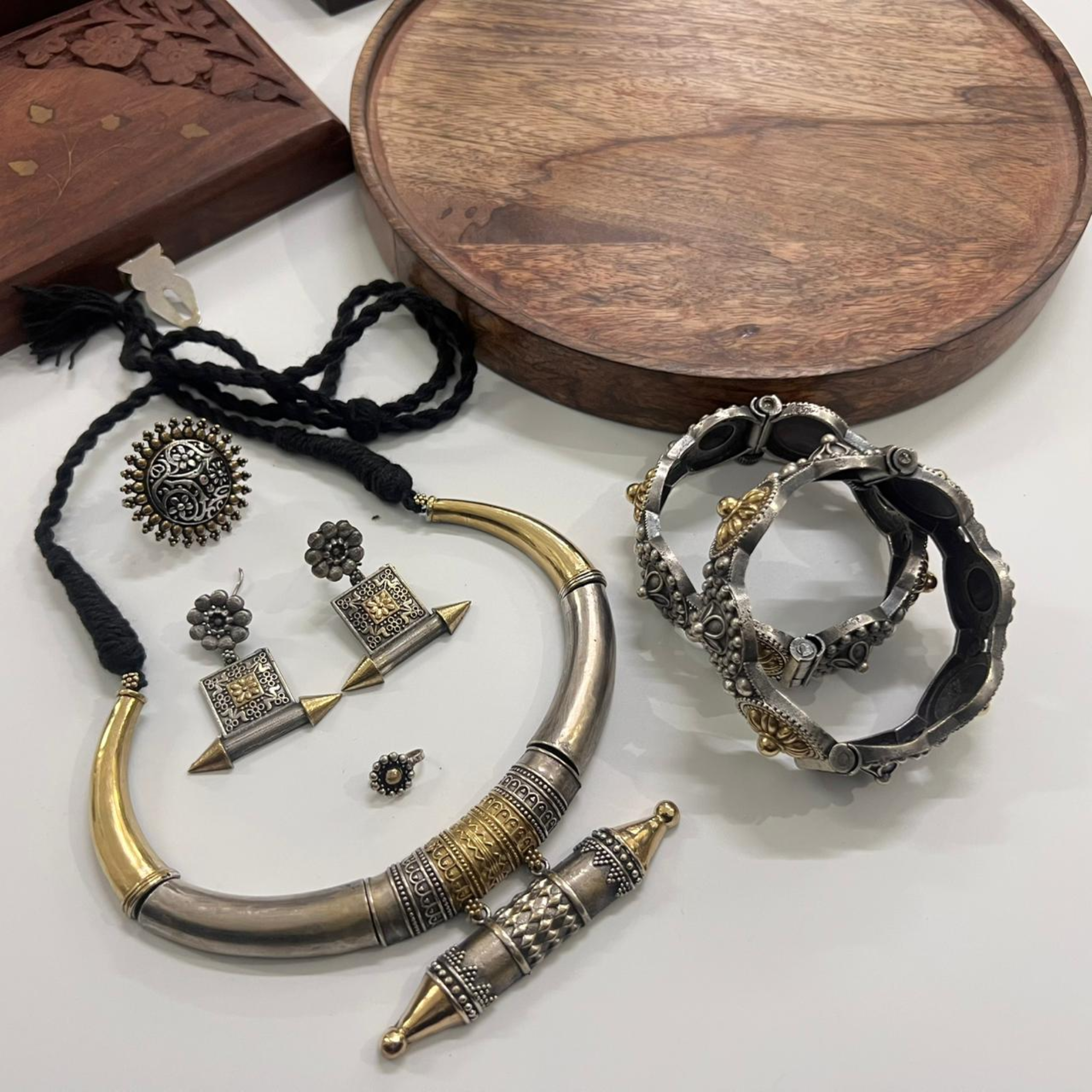 Made from premium oxidised German silver, this designer set features an intricately engraved choker necklace, matching earrings, a bold statement ring, a nose pin, and a pair of beautifully detailed bangles all enhanced with elegant gold-wash accents and delicate carving.