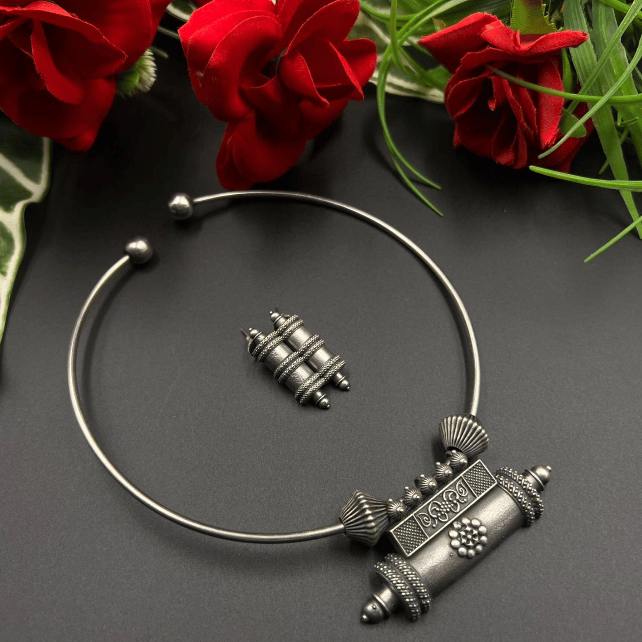 This choker is absolutely beautiful! The oxidized silver finish and bold pendant make it such a statement piece. It’s lightweight, comfortable, and looks even better in person.