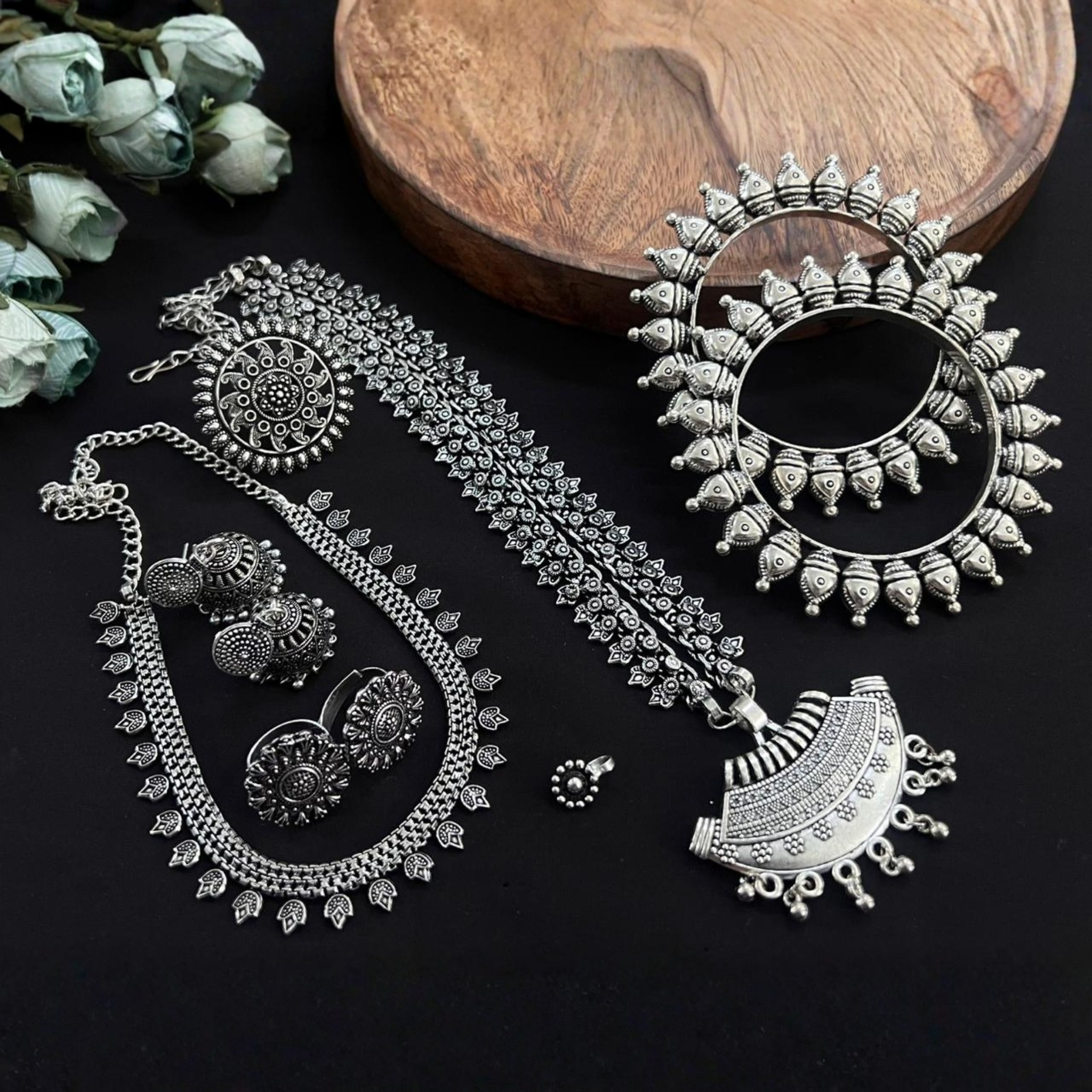 Handcrafted Oxidised Detailing: Each piece features deep engraved patterns and fine tribal artistry.