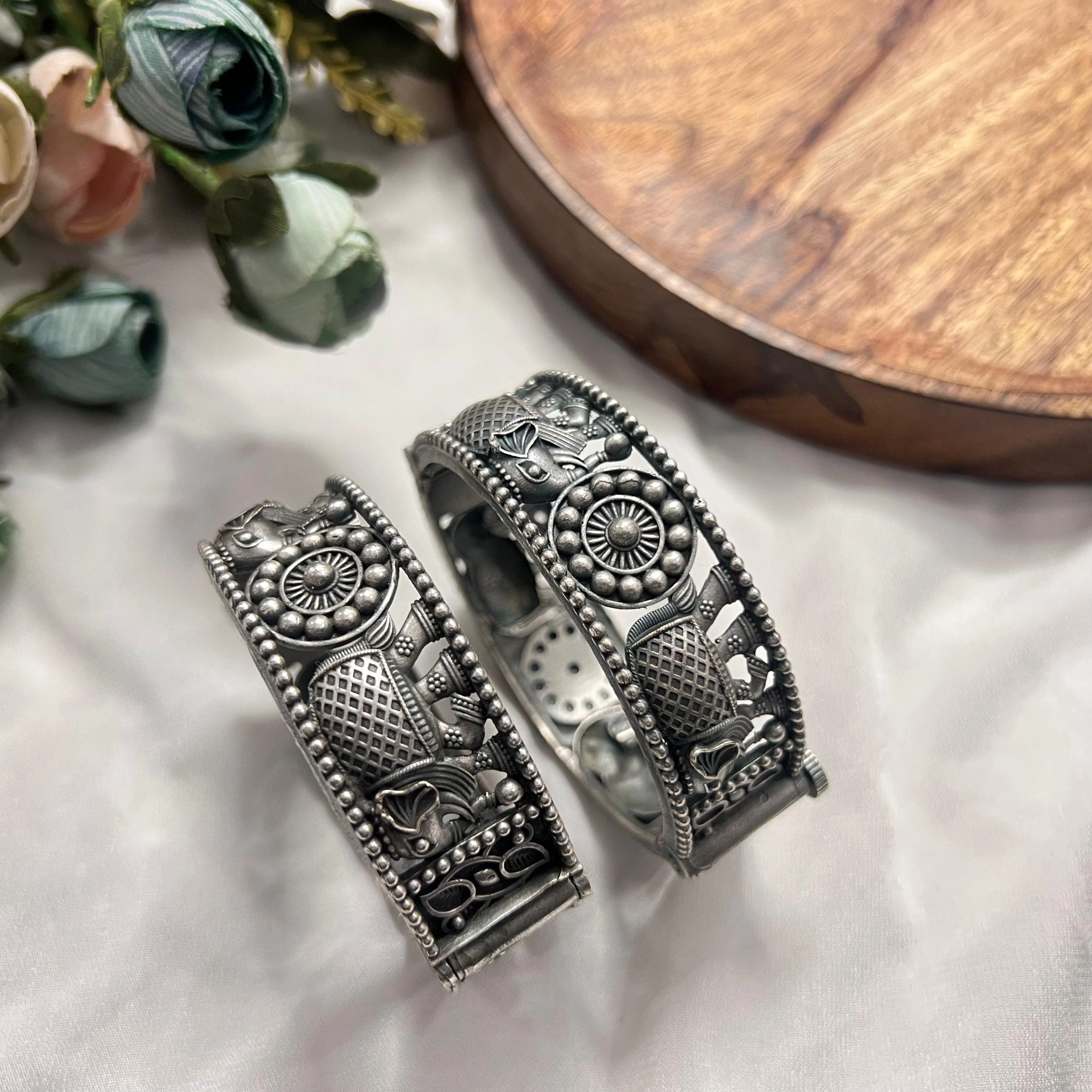 Crafted in premium oxidized brass with an antique silver finish, these bangles are durable, comfortable, and perfect to elevate your ethnic look. The detailed artistry makes them suitable for festive occasions, weddings, and cultural gatherings.
